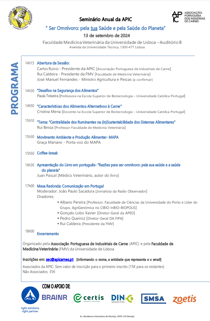 A APIC — Associação Portuguesa dos Industriais de Carnes realiza o seu seminário anual, este ano, sob o título ”Ser Omnívoro: pela tua Saúde e pela Saúde do Planeta”, no dia 13 de Setembro de 2024, na Faculdade de Medicina Veterinária da Universidade de Lisboa.