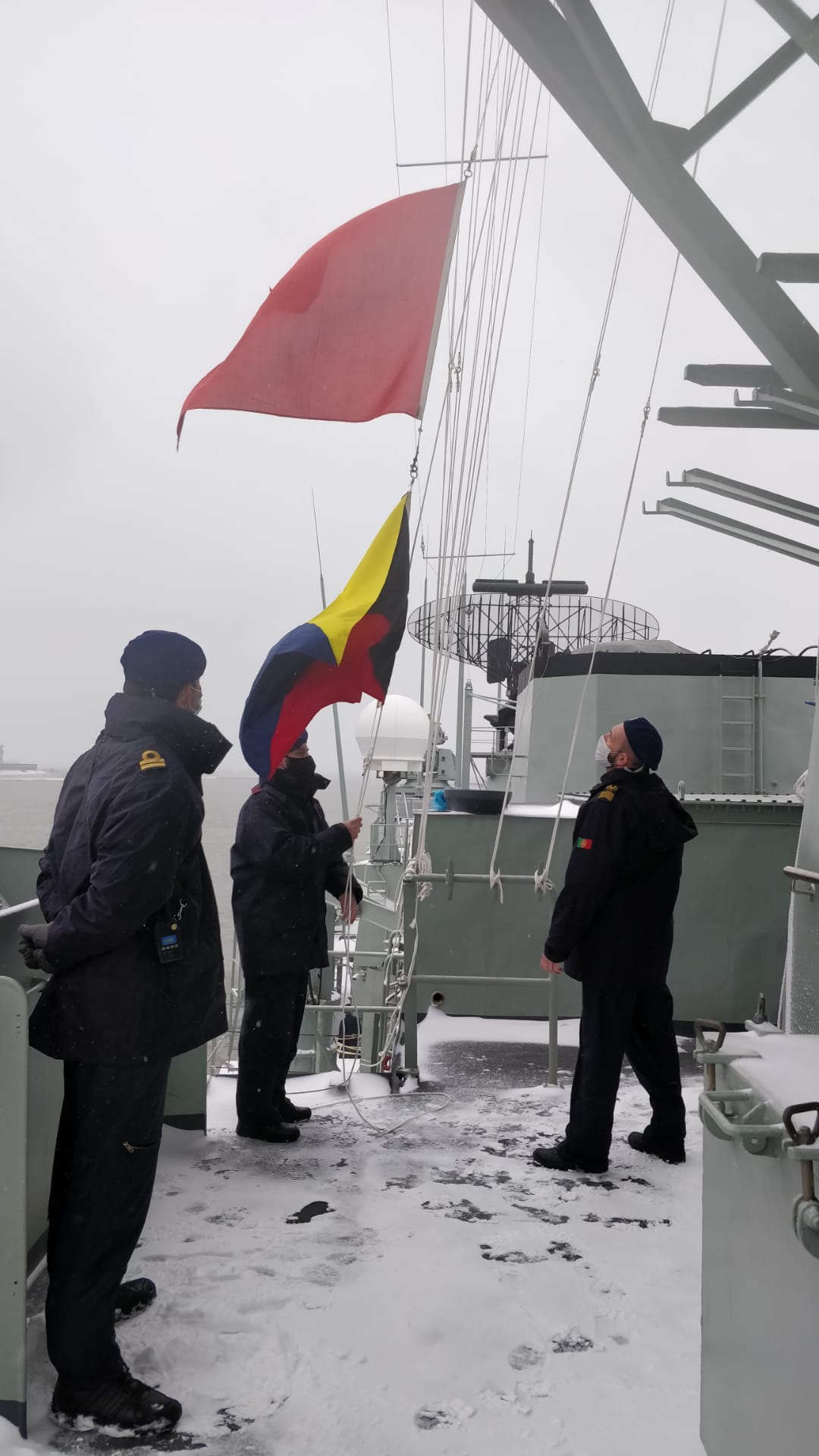 A fragata Bartolomeu Dias, da Marinha Portuguesa, actualmente em Den Helder, Holanda do Norte, recebeu a bordo a visita da neve que se faz sentir por estes dias nos Países Baixos, causada pela tempestade Darcy.